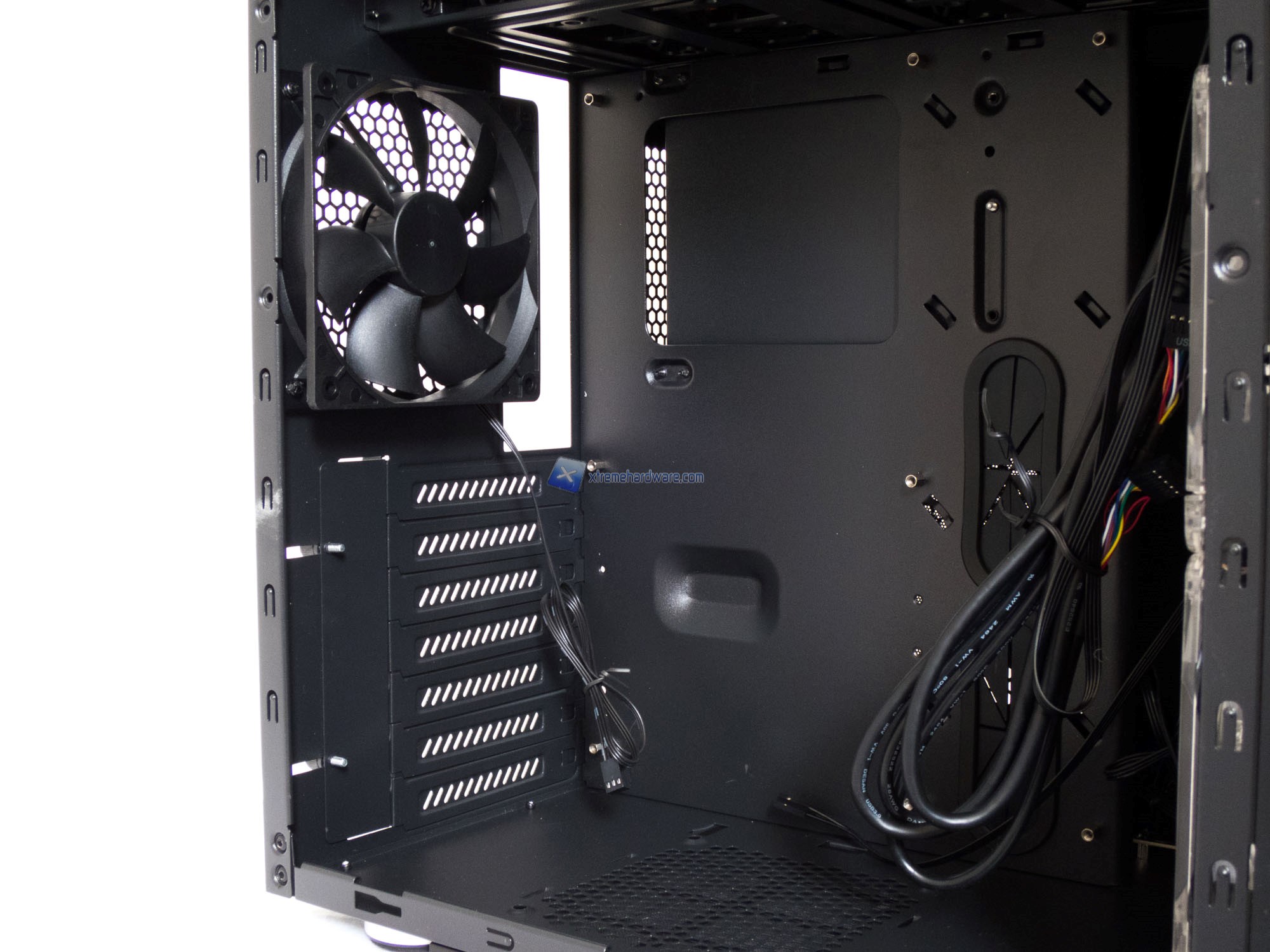 Rimosse le paratie possiamo accedere all’interno del case per vedere da più vicino lo spazio messoci a disposizione e le soluzioni adottate. Ad una prima occhiata lo spazio non manca e anzi ci sembra di avere molto spazio per organizzare al meglio cavi PSU e componenti.