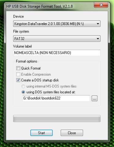- Eseguire l'HP USB Format Tool e impostare come da immagine seguente:
